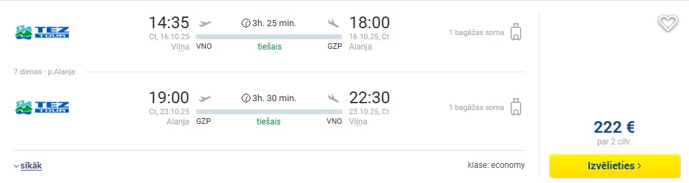 Datumi: 16.-23.10. 111 EUR turp un atpakaļ vienam cilvēkam vai 222 EUR diviem