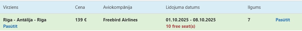 Datumi: 1.-8.10. 139 EUR turp un atpakaļ vienam cilvēkam