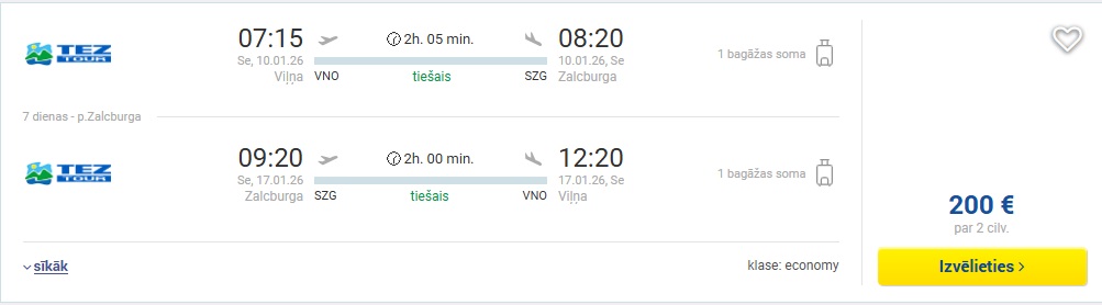Datumi: 10.-17.01. 100 EUR turp un atpakaļ vienam cilvēkam vai 200 EUR diviem