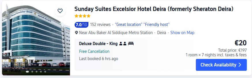 4* viesnīca Sunday Suites Excelsior Hotel Deira (formerly Sheraton Deira). Divvietīgs numurs uz 7 naktīm – 197 EUR.