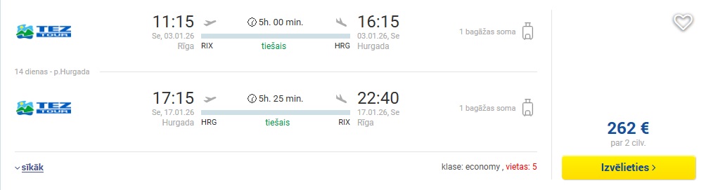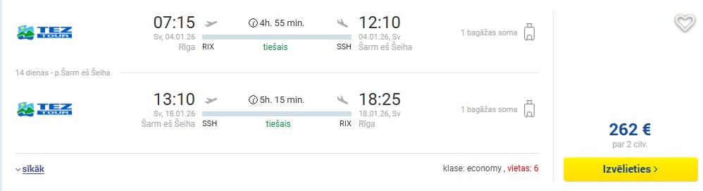 Datumi: 4.-18.01. 131 EUR turp un atpakaļ vienam cilvēkam vai 262 EUR diviem