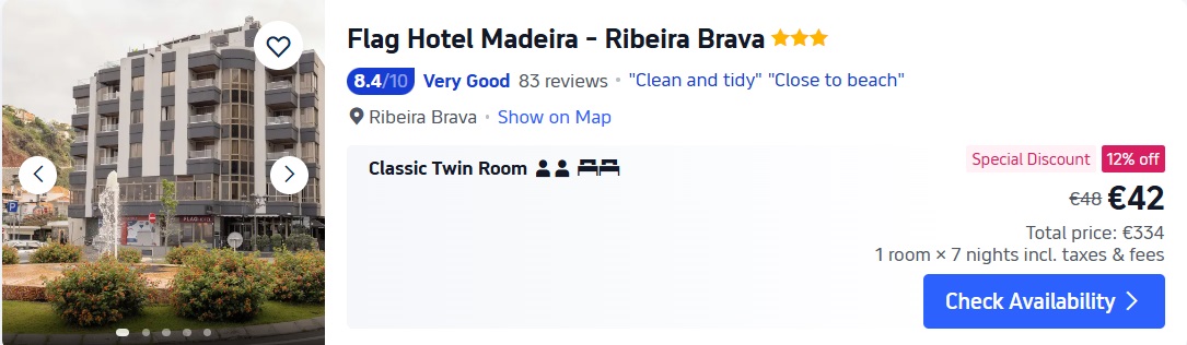 3* viesnīca Flag Hotel Madeira – Ribeira Brava. Divvietīgs numurs uz 7 naktīm – 334 EUR.
