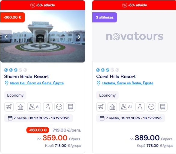 Novatours all inclusive ceļojums no Rīgas uz Šarm es Šeihu.