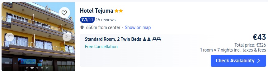 2* viesnīca Hotel Tejuma. Divvietīgs numurs uz 7 naktīm – 326 EUR.