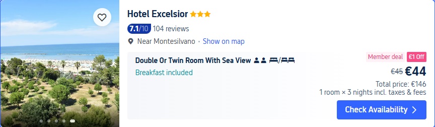 Viesnīca Excelsior atrodas Montesilvano, 100 metru attālumā no Montesilvano pludmales. Viesiem tiek piedāvātas naktsmītnes ar koplietošanas atpūtas telpu, bezmaksas privāto autostāvvietu, terasi un restorānu. Trīszvaigžņu viesnīca piedāvā bāru un numurus ar gaisa kondicionētāju, bezmaksas bezvadu internetu un privātu vannas istabu. Naktsmītnē viesiem tiek piedāvāta apkalpošana numurā, konsjerža pakalpojumi un bagāžas glabātuve.