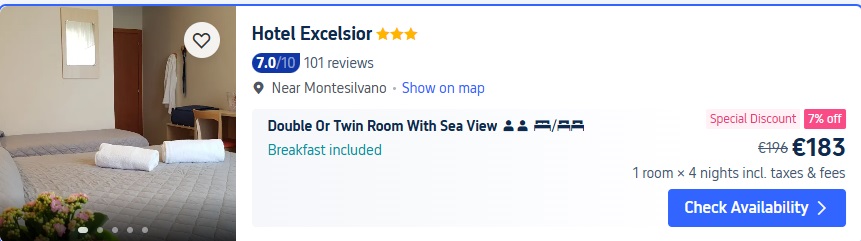 Viesnīca Excelsior atrodas Montesilvano, 100 metru attālumā no Montesilvano pludmales. Viesiem tiek piedāvātas naktsmītnes ar koplietošanas atpūtas telpu, bezmaksas privāto autostāvvietu, terasi un restorānu. Trīszvaigžņu viesnīca piedāvā bāru un numurus ar gaisa kondicionētāju, bezmaksas bezvadu internetu un privātu vannas istabu. Naktsmītnē viesiem tiek piedāvāta apkalpošana numurā, konsjerža pakalpojumi un bagāžas glabātuve.