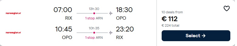 Norwegian lidojumi no Rīgas uz Portu ar pārsēšanos Stokholmā. Lidojumi nav savienoti.