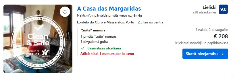 Viesnīca A Casa das Margaridas. Divvietīgs numurs uz 4 naktīm – 208 EUR.
