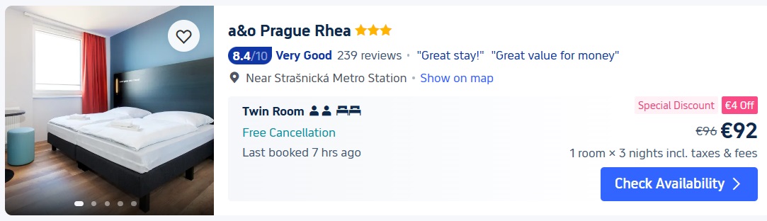3* viesnīca a&o Prague Rhea. Divvietīgs numurs uz 4 naktīm – 92 EUR.