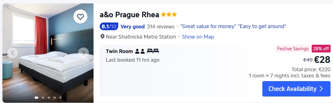 3* viesnīca a&o Prague Rhea. Divvietīgs numurs uz 7 naktīm – 220 EUR.