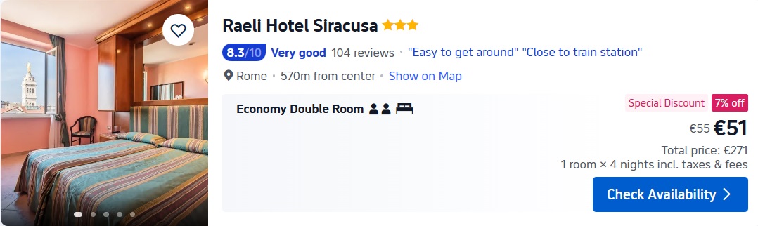 3* viesnīca Raeli Hotel Siracusa. Divvietīgs numurs uz 4 naktīm – 271 EUR.