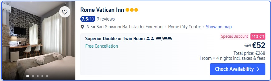 3* viesnīca Rome Vatican Inn. Divvietīgs numurs uz 4 naktīm – 268 EUR.
