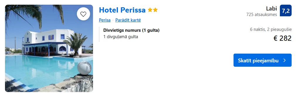 Viesnīca Hotel Perissa. Divvietīgs numurs uz 6 naktīm – 282 EUR.