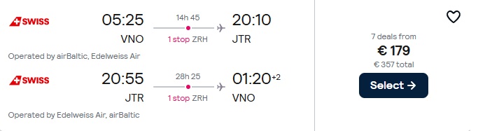 Swiss lidojumi no Viļņas uz Santorīni ar pārsēšanos Cīrihē.