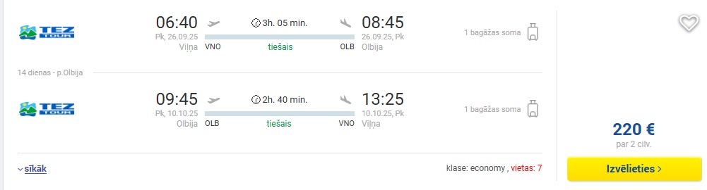 Datumi: 26.09.-10.10. 110 EUR turp-atpakaļ vienam cilvēkam vai 220 EUR diviem