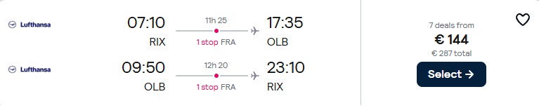 Lufthansa lidojums no Rīgas uz Olbiju ar pārsēšanos Frankfurtē.