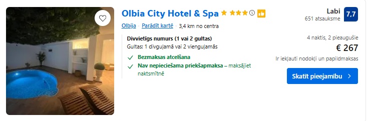 4* viesnīca Olbia City Hotel & Spa. Divvietīgs numurs uz 4 naktīm – 267 EUR.