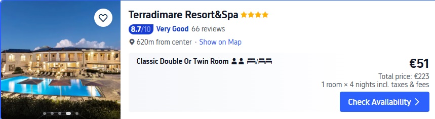 4* viesnīca Terradimare Resort&Spa. Divvietīgs numurs uz 4 naktīm – 223 EUR.