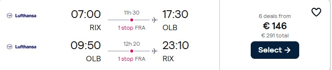 Lufthansa lidojums no Rīgas uz Olbiju ar pārsēšanos Frankfurtē.