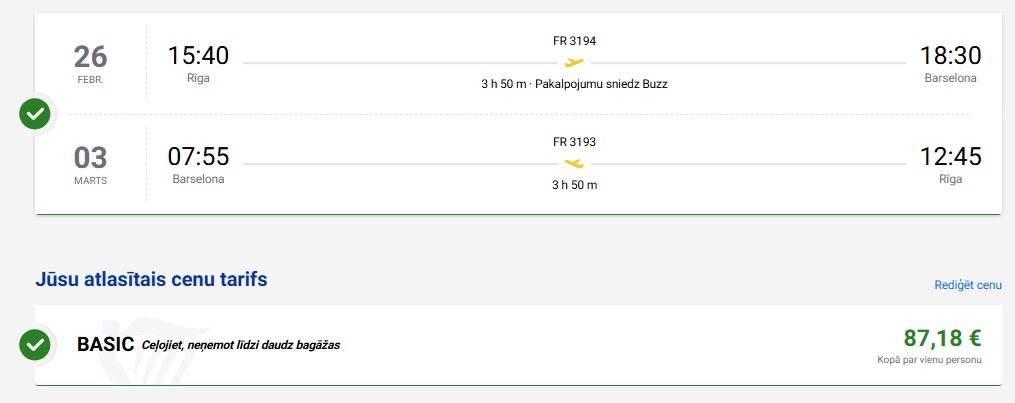 Tiešie Ryanair lidojumi no Rīgas uz Barselonu (bagāža nav iekļauta cenā).