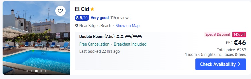 Vienzvaigznes viesnīca El Cid atrodas Sidžesas centrā, tikai 250 metru attālumā no pludmales. Viesiem tiek piedāvātas naktsmītnes ar privātām labierīcībām un peldbaseins ar sauļošanās terasi. Cenā ir iekļautas bufetes tipa brokastis.