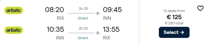 Tiešie Air Baltic lidojumi no Rīgas uz Insbruku.