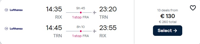 Lufthansa lidojumi no Rīgas uz Turīnu ar pārsēšanos Frankfurtē.