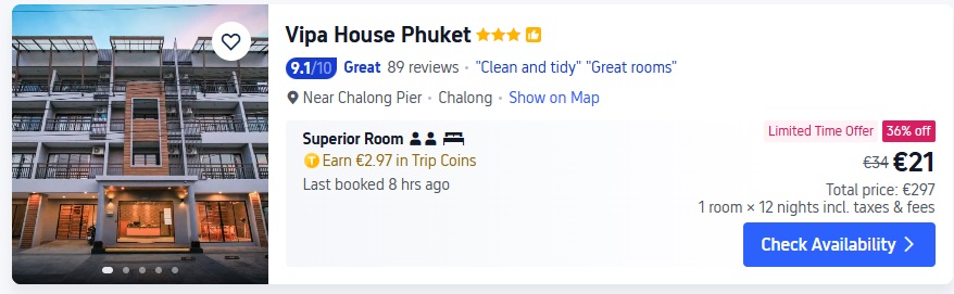 3* viesnīca Vipa House Phuket. Vienvietīgs numurs uz 12 naktīm – 297 EUR.