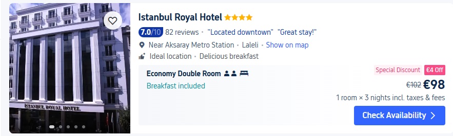 4* viesnīca Istanbul Royal Hotel. Divvietīgs numurs uz 3 naktīm ar brokastīm – 98 EUR.