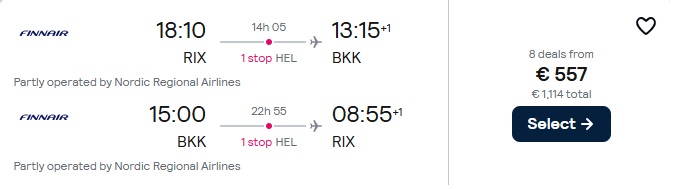 Finnair lidojumi no Rīgas uz Bangkoku ar pārsēšanos Helsinkos.