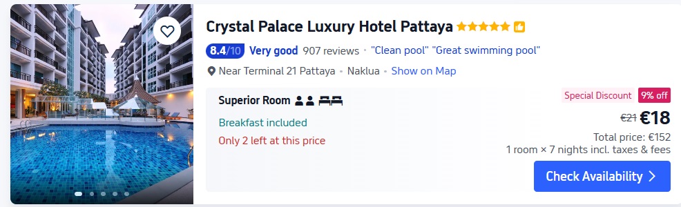 5* viesnīca Crystal Palace Luxury Hotel Pattaya. Divvietīgs numurs uz 7 naktīm – 152 EUR.