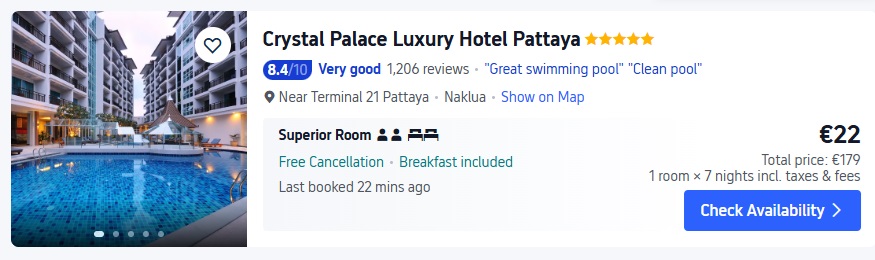 5* viesnīca Crystal Palace Luxury Hotel Pattaya. Divvietīgs numurs uz 7 naktīm – 179 EUR.