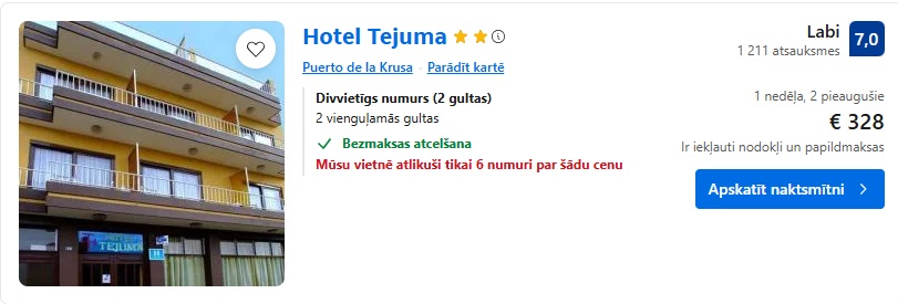 2* viesnīca Hotel Tejuma. Divvietīgs numurs uz 7 naktīm – 328 EUR.