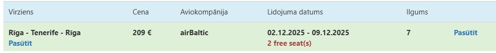 Čarterlidojums no Rīgas uz Tenerifi.