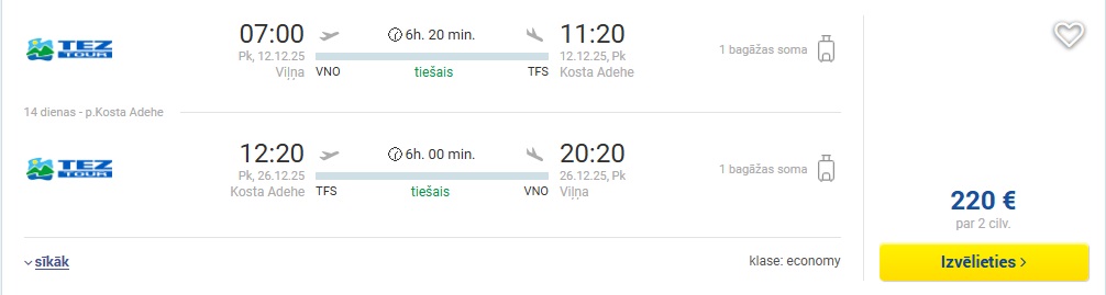 Čarterlidojums no Viļņas uz Tenerifi.
