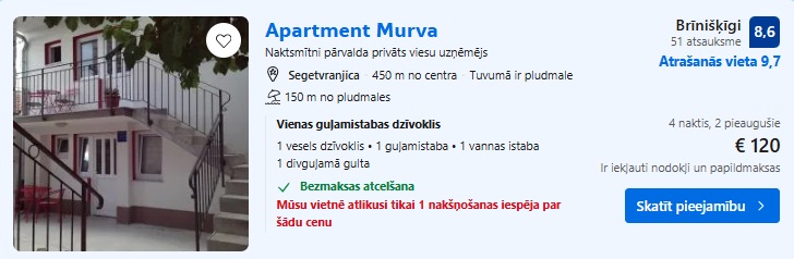 Apartamenti Apartment Murva uz 4 naktīm – 120 EUR.