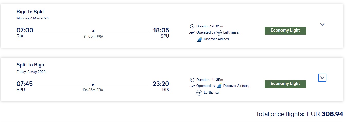 Lufthansa lidojumi no Rīgas uz Splitu ar pārsēšanos Frankfurtē.