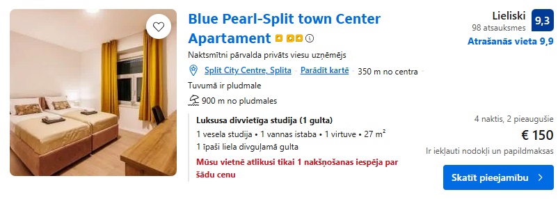 Apartamenti Blue Pearl-Split town Center Apartament uz 4 naktīm – 150 EUR, uz 7 naktīm – 221 EUR (17.-24.11.)