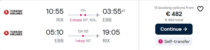 Turkish Airlines lidojumi no Rīgas uz Entebi ar pārsēšanos Stambulā.