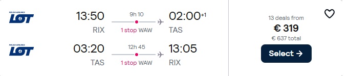 LOT Airlines lidojumi no Rīgas uz Taškentu ar pārsēšanos Varšavā.