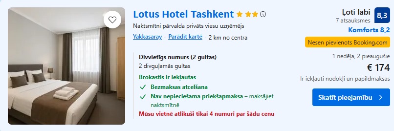 3* viesnīca Lotus Hotel Tashkent. Divvietīgs numurs uz 7 naktīm ar brokastīm – 174 EUR.
