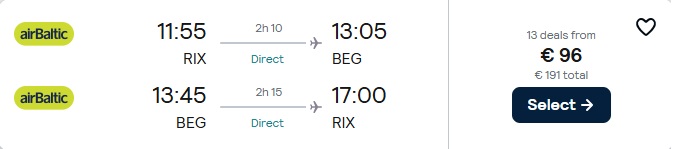 Tiešie Air Baltic lidojumi no Rīgas uz Belgradu.