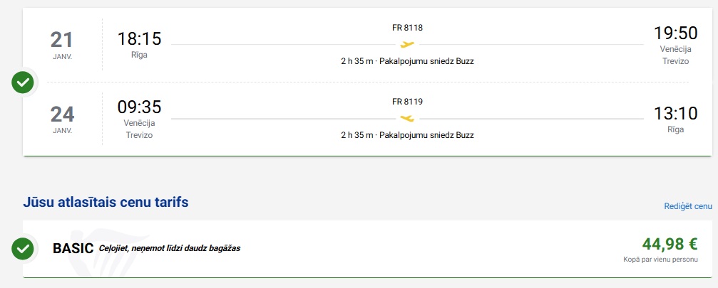 Tiešie Ryanair lidojumi no Rīgas uz Venēciju (bagāža nav iekļauta cenā).