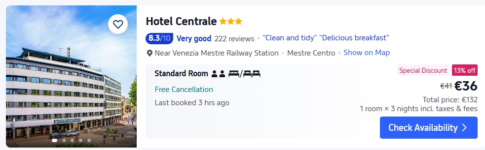 Viesnīca Centrale atrodas Mestres pilsētas centrā. Autobusu pietura, no kuras kursē transports līdz Venēcijai, ir tikai 20 metru attālumā. Katru dienu viesiem tiek piedāvātas bufetes tipa brokastis.