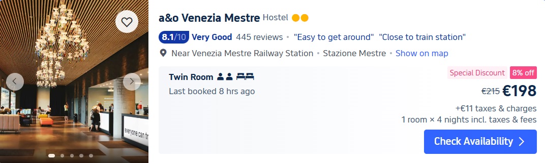 Viesnīca a&o Hostel Venezia Mestre. Divvietīgs numurs uz 4 naktīm – 198 EUR.