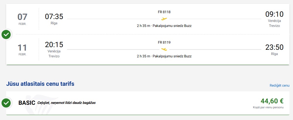 Tiešie Ryanair lidojumi no Rīgas uz Venēciju (bagāža nav iekļauta cenā).