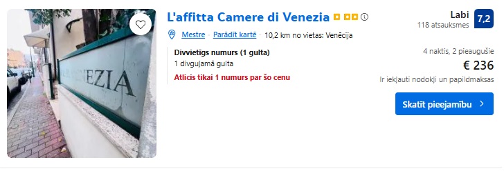 Viesnīca L’affitta Camere di Venezia. Divvietīgs numurs uz 4 naktīm – 236 EUR.