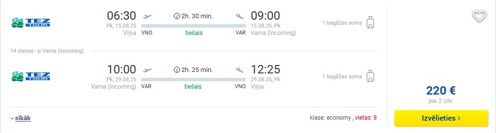 Datumi: 15.-29.08. 110 EUR turp un atpakaļ vienam cilvēkam vai 220 EUR diviem
