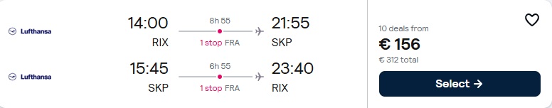 Lufthansa lidojumi no Rīgas uz Skopje ar pārsēšanos Frankfurtē.